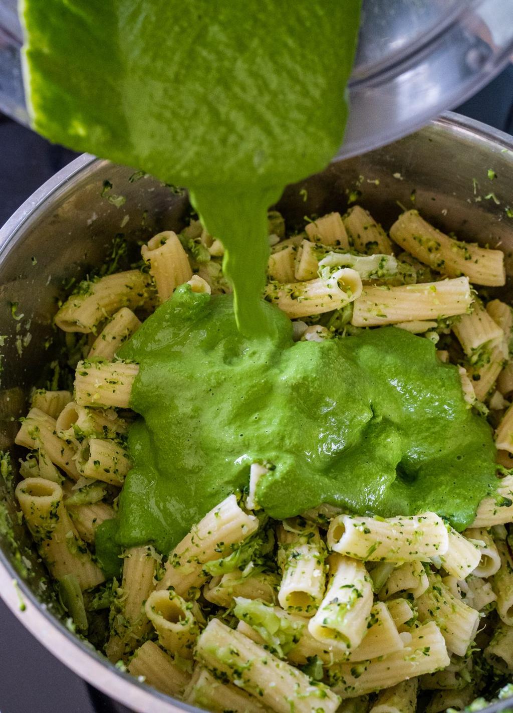 - Add cooked vegetables to a blender with basil, nutritional yeast or parmesan, miso if using, and nuts or seeds if using.